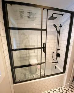 built a ceramic tile shower with glass wall and door. They installed in-floor